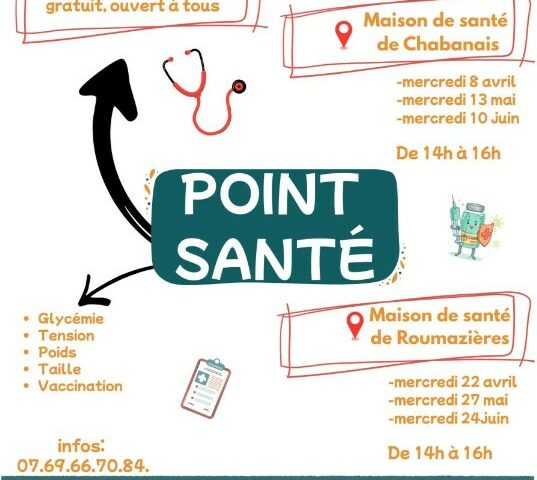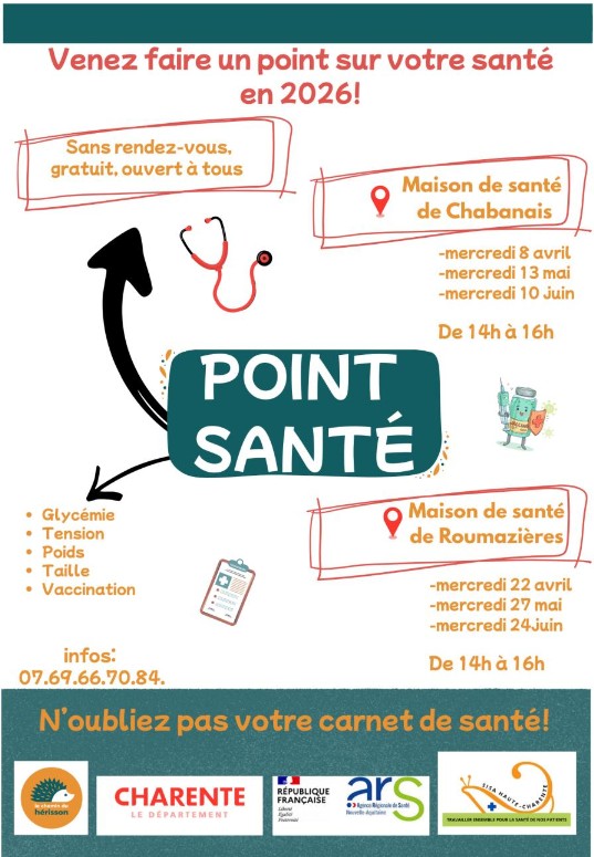 Des points santé sont proposés une fois par mois dans les maisons de santé de Chabanais et de Terres-de-Haute-Charente. Ces points santé sont ouverts à tout public, enfants et adultes, avec ou sans droits ouverts.