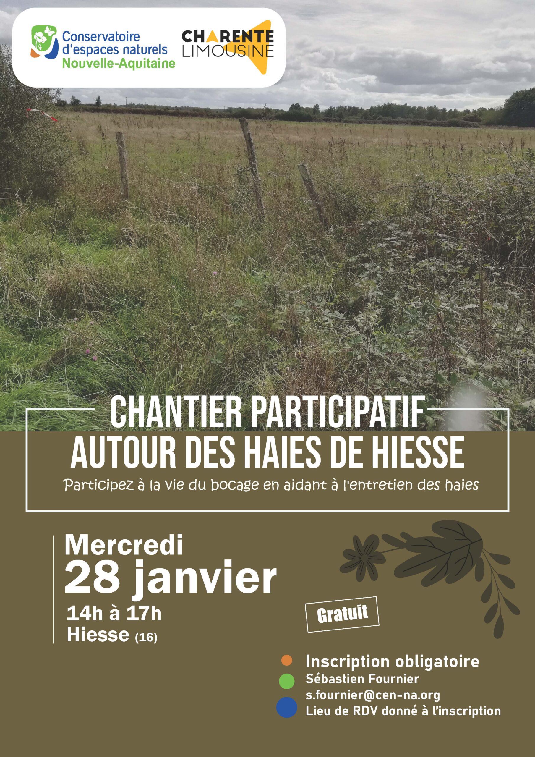 Le Conservatoire d’espaces naturels de Nouvelle-Aquitaine et la communauté de communes Charente Limousine organisent un chantier participatif autour des haies de Hiesse le Mercredi 28 janvier à 14h